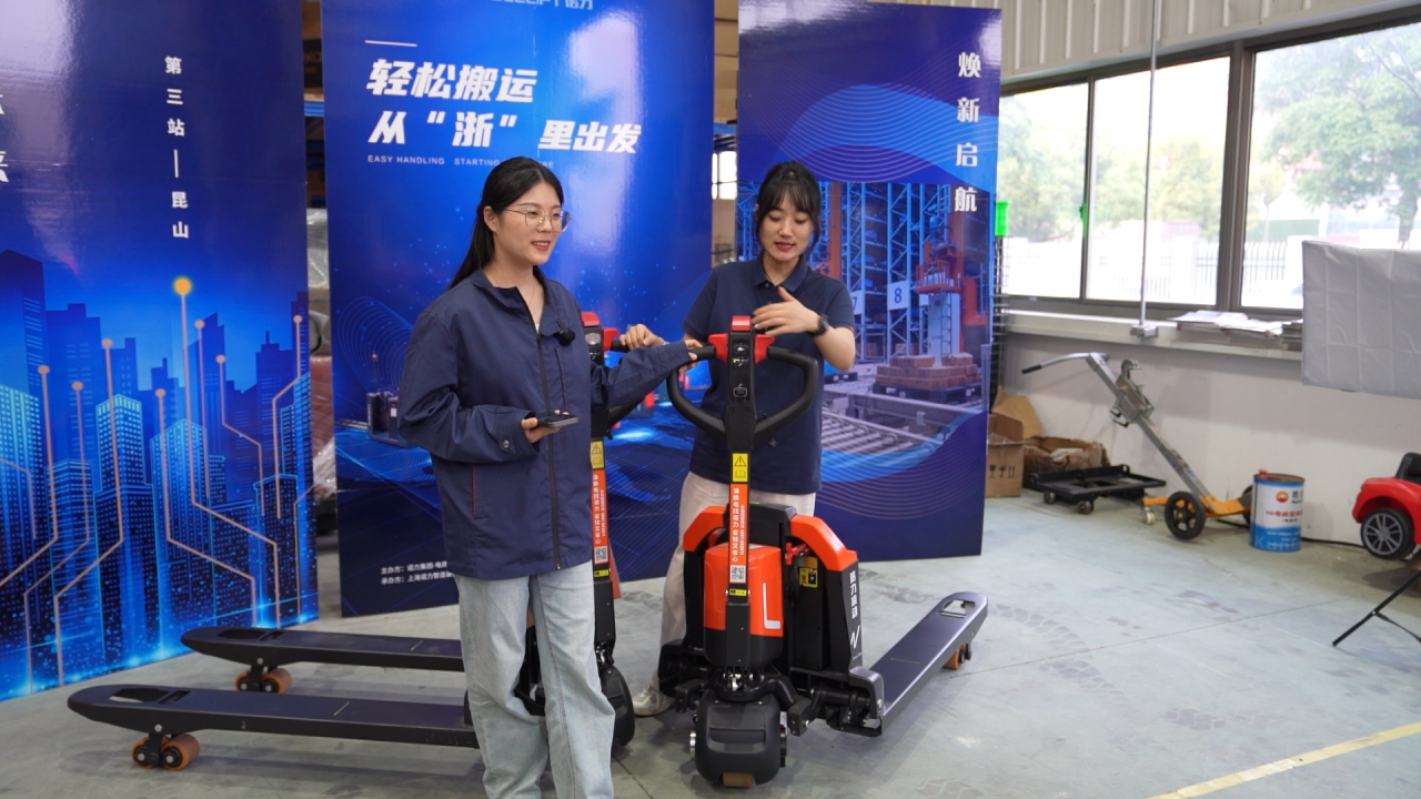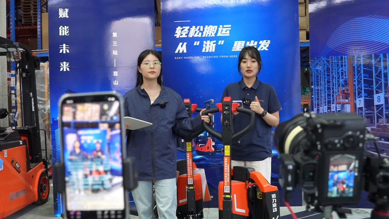 5月7日,在苏州诺力叉车有限公司仓库内,两位主播正通过线上直播,向直播间网友展示企业最新推出的“凌动”系列绿色环保电动叉车,引流刺激线下门店销售。