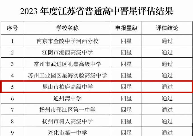日前,江苏省教育厅发布《关于公布2023年度普通高中星级评估结果的通知》,我市柏庐高级中学正式晋评为江苏省四星级高中,周市高级中学正式晋评为江苏省三星级高中。至此,我市共建成首批省高品质示范高中培育学校1所、省四星级高中6所、三星级高中3所。