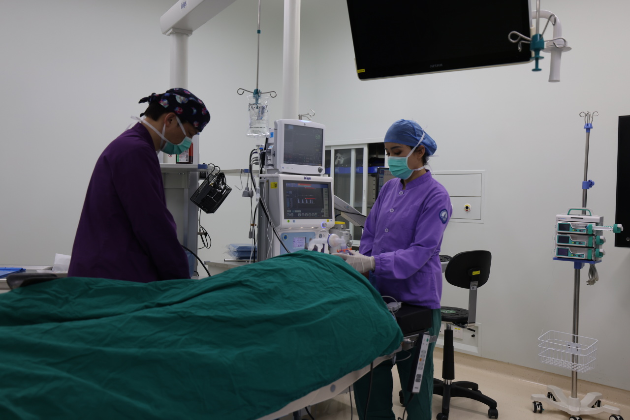 在市一医院手术室内,阿图什市人民医院麻醉科医生热孜亚正跟着老师进行一台手术。这台手术由她的老师市一医院麻醉科主任杭黎华进行麻醉,热孜亚在一旁仔细观看操作步骤,遇到不懂的问题默默记下来,手术结束后立刻向老师请教。