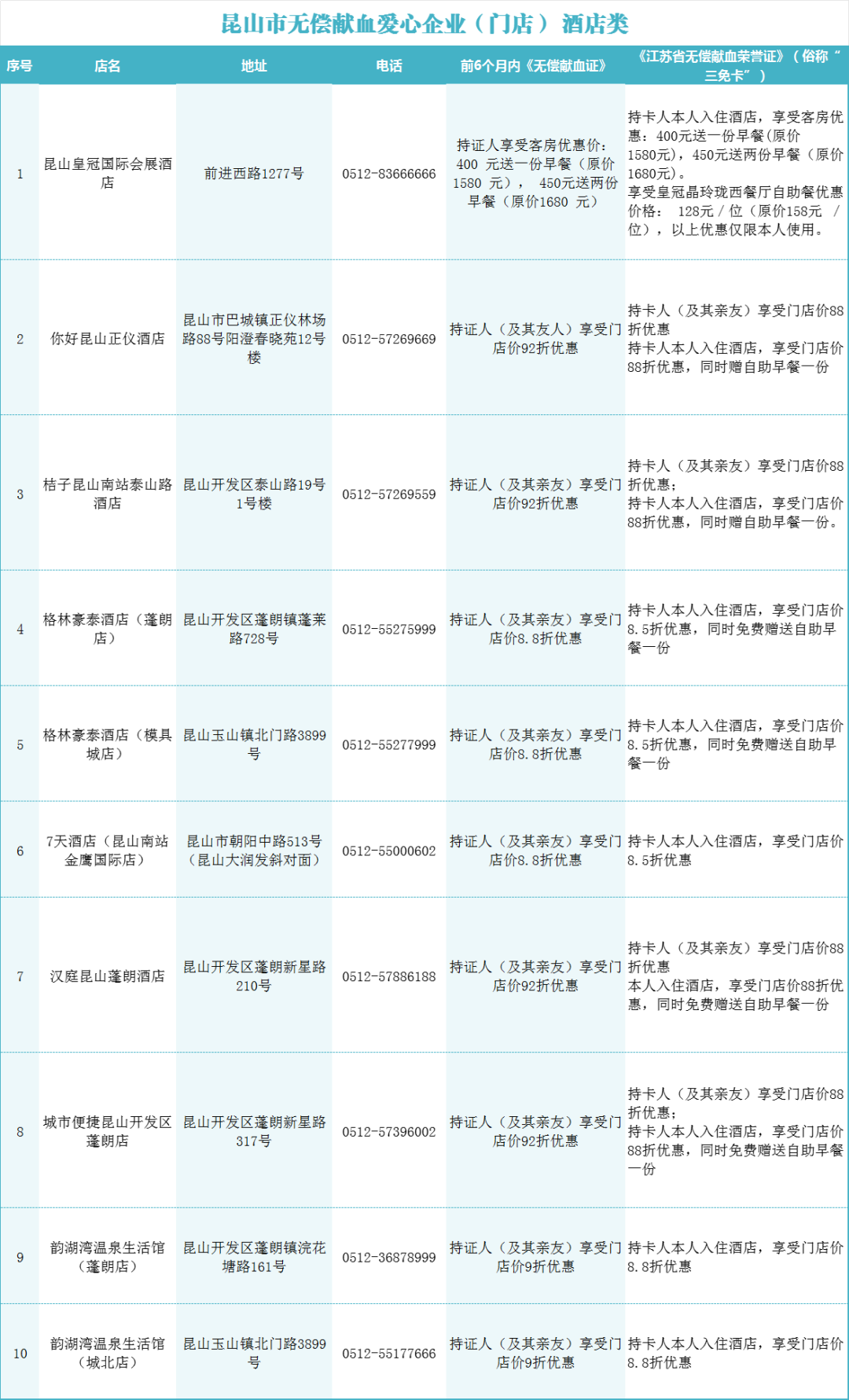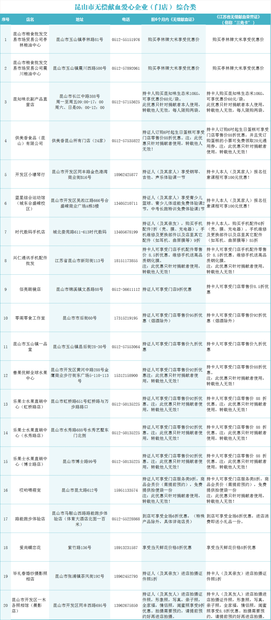 备注:昆山市无偿献血爱心企业(门店)正在不断扩充中,更多优惠福利敬请期待。