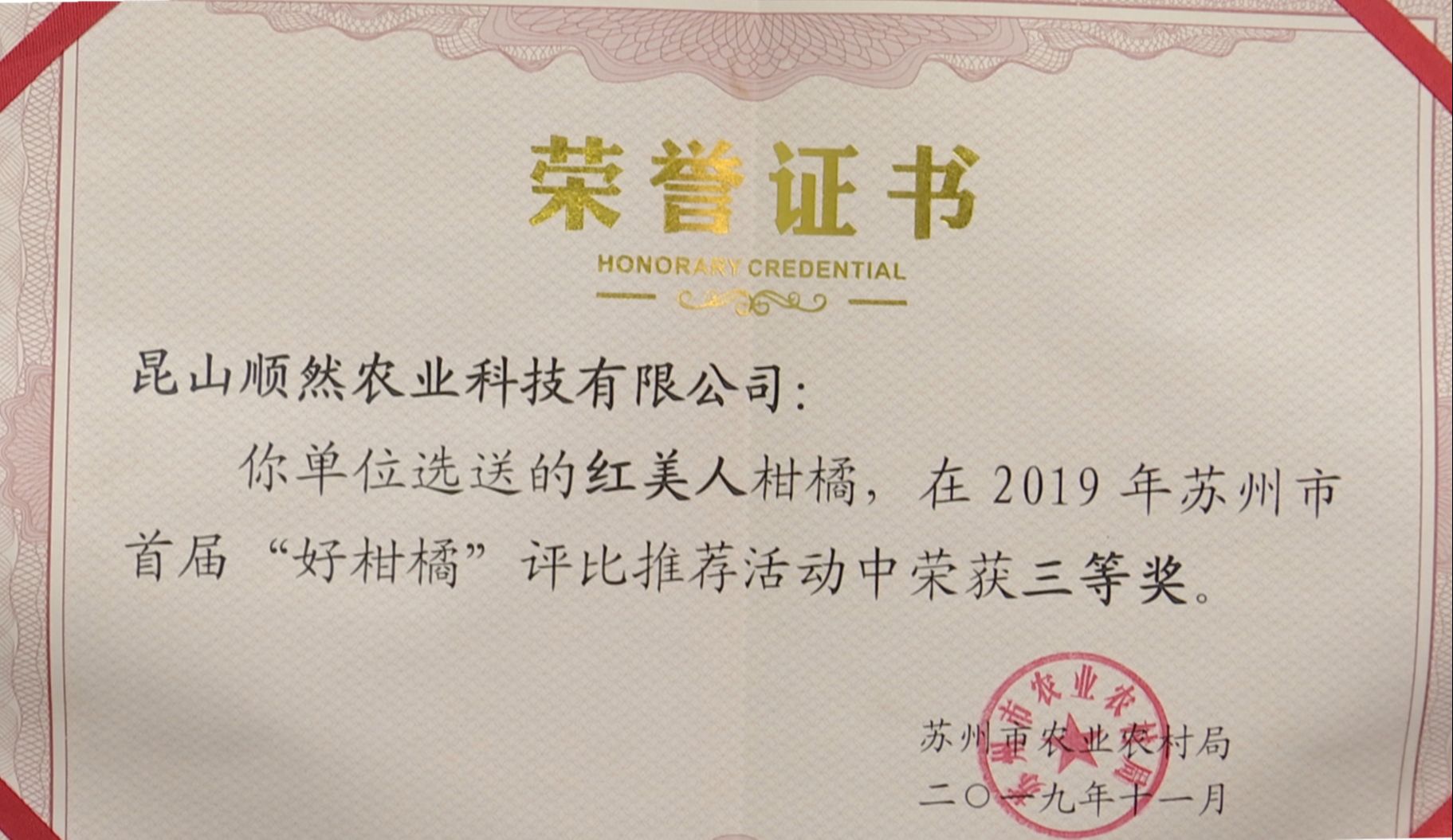 开弓没有回头箭,我没有气馁,反而更加执着和坚定。在我的精心呵护下,五年间,原本小拇指粗细的小“美人”长成了手腕粗细、亭亭玉立的大“美人”。2019年11月,基地第一批20亩“红美人”成熟上市,首次亮相就得到一致好评,并在苏州市首届“好柑橘”评比推荐活动中获得三等奖,这犹如一剂“强心针”,让我信心倍增。