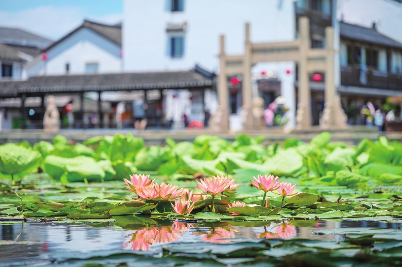 亭林园内、古镇河道,荷花、莲花已然悄悄开放,花瓣细腻如绸、色泽鲜嫩,形如聚光灯下舞者的裙摆,在宛如翡翠盘的荷叶衬托下,优雅地绽放;