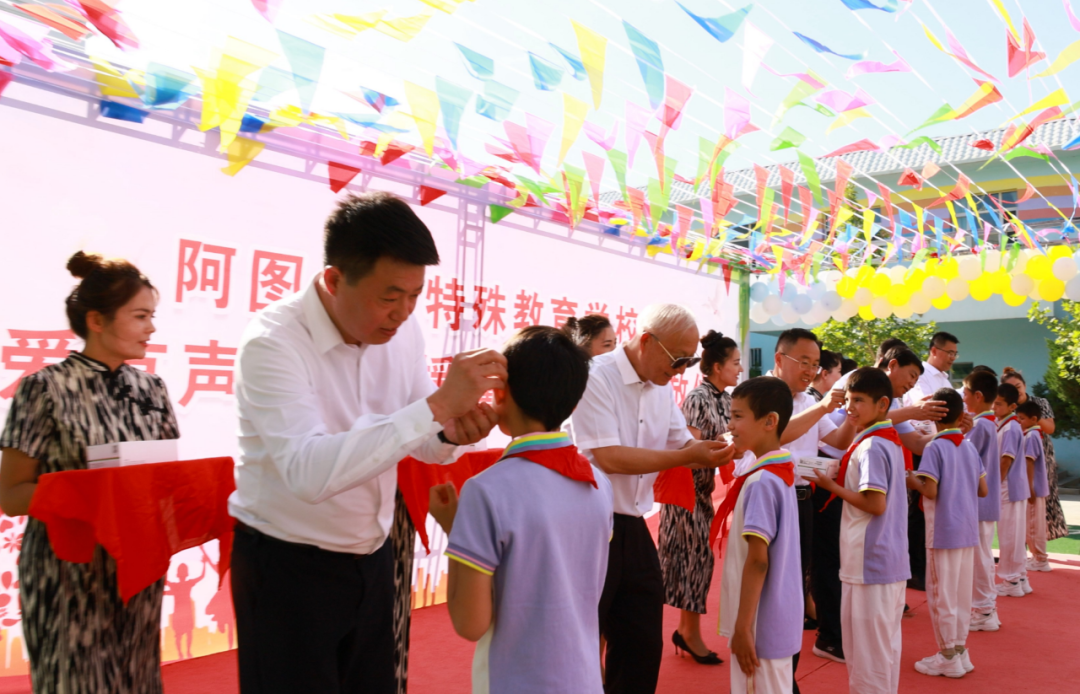 阿图什市特殊教育学校建于2012年,是新疆克州三县一市唯一的一所集聋哑、培智教育于一体的九年一贯寄宿制特殊教育学校,现有在读学生122名。今年4月,昆山援疆工作组携手江苏华科事业群慈爱基金会、昆山市慈善总会为这所学校的孩子们进行听力筛查、耳膜取样。本次“关爱有声 助力援疆”助听器发放仪式为33名学生捐赠63台助听器,共计价值200万元。