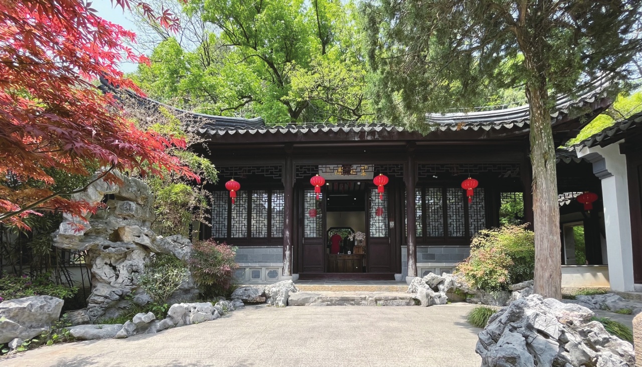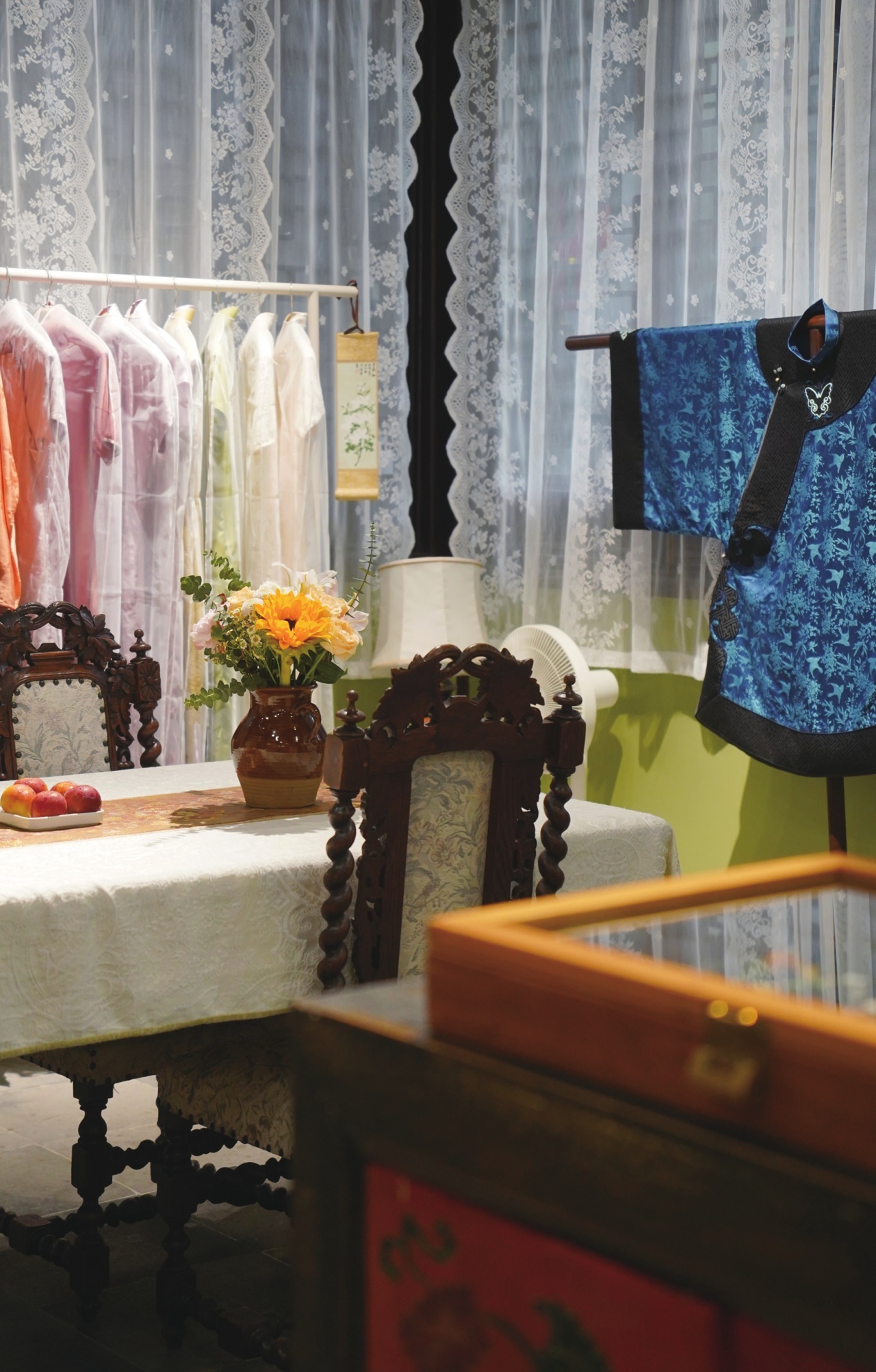 “苏舟城外”旗袍定制工作室位于亭林园半山腰处的翠微阁,自是有一番曲径通幽、阶柳庭花之美,这里一桌一椅、一花一木、轩楹高爽尽显古色古香的优雅与雍容。远离闹市、避开人流,是朱琴香选址于此的初衷。