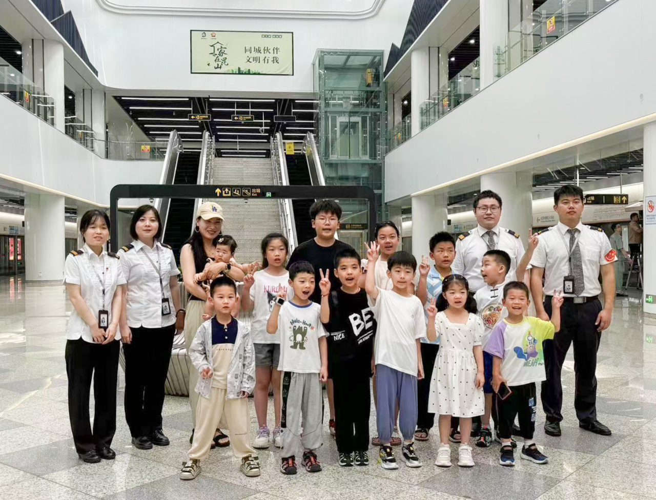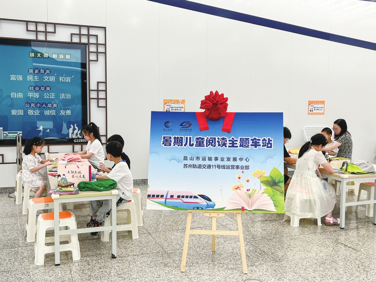 为积极推进我市儿童友好城市建设,昆山交通联合苏州轨道交通,将夏桥站升级打造为“暑期儿童阅读主题车站”,设有亲子阅读区和学生自习区,并组织员工向阅读区捐赠图书。据悉,亲子阅读区设在夏桥站站厅层3号口附近,为市民提供了童话故事、科普读物、益智绘本等适合少年儿童阅读的书籍;学生自习区设在夏桥站站厅层1号口附近,供学生在此纳凉学习。每天,昆山交通和苏州轨交员工组成的志愿者队伍都会来到这里,保障孩子们的安全。