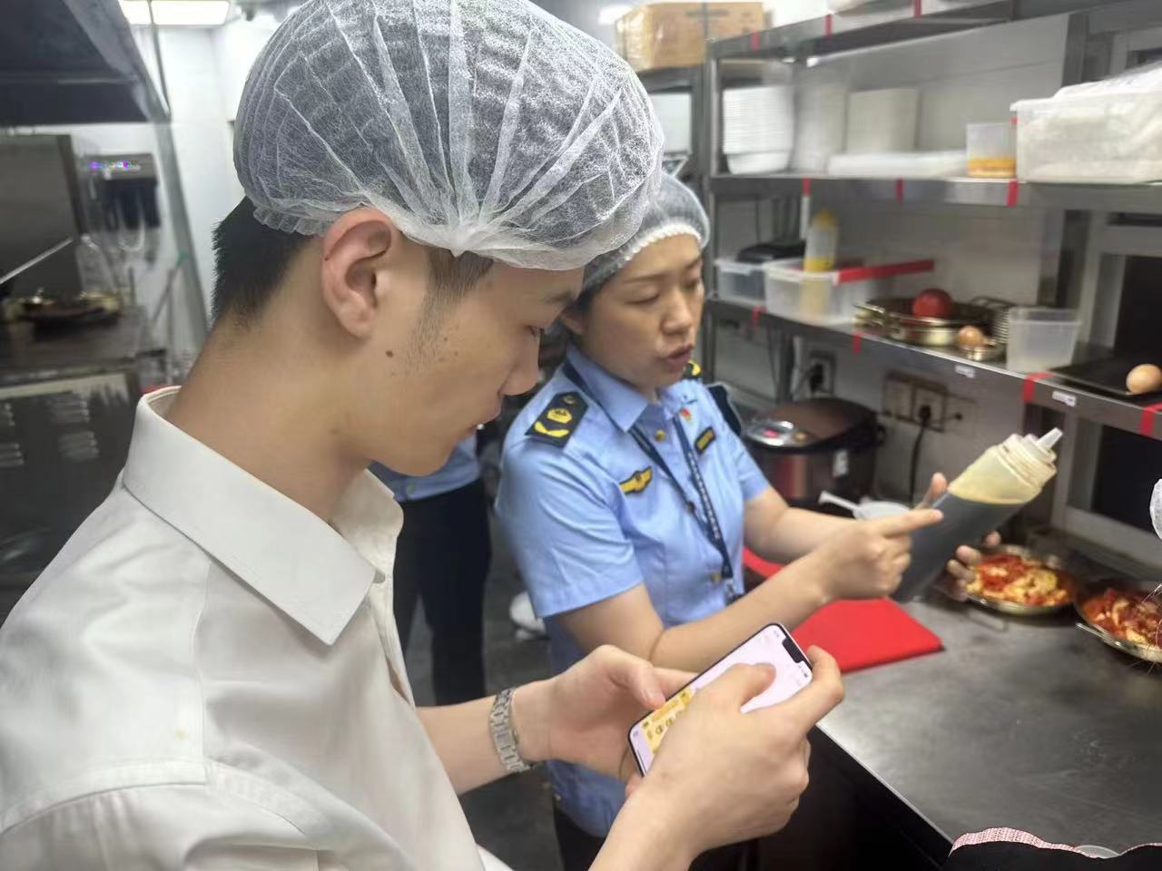 在金鹰国际购物中心,执法人员重点检查了烘焙类门店,检查面包、蛋糕等食品原料进货渠道、采购验收、加工环境卫生、食品添加剂及食品标签使用、从业人员健康证明等情况,检查了货架及摊位上摆放的食品标签张贴是否规范,是否标注了食品的名称、生产日期、保质期、储存条件等信息。随后,执法人员又来到商场内各家炒菜店、自助餐厅等,检查经营者证照是否齐全有效、进货查验和索证索票制度是否落实到位、经营场所卫生环境是否达标、生熟食品存放是否规范等。检查中,执法人员要求各家食品经营单位严格做好餐饮商户的日常管理,对各项食品安全隐患做到有效闭环处理,不断提升商圈餐饮行业服务质量,重视消费者服务,以正确理性的方式对待客诉,切实提升消费者满意度,共同构筑监管部门、商场管理方、消费者、餐饮商家及时沟通、规范经营的食品安全社会共治新局面。