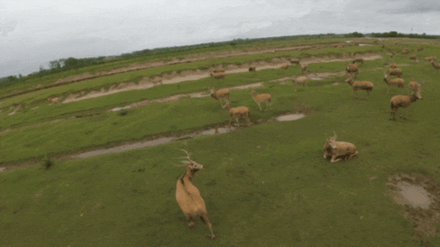 如何让观众沉浸式欣赏麋鹿?42倍长焦镜头、夜视仪、航拍摄像机、穿越机、高倍数摄像机……全都招呼上!麋鹿身边有很多鸟类,能否模仿它们的视角?穿越机申请出战!