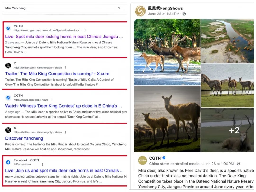 CGTN则将“鹿王争霸”的胜景传递给全球,相关内容在Google搜索中占据高位,海外阅读量达405万,独立用户访问量累计393万,通过“直播+vlog+短视频+社交图集”的组合,让世界看到了中国生态文明建设成就。