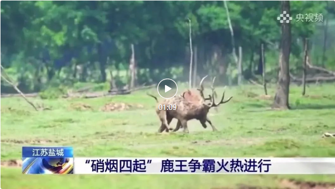 初夏,清晨。江苏省大丰麋鹿国家级自然保护区,“鹿王争霸”即将进入“决赛圈”。两头雄鹿面对面站立、逐渐逼近,直到鼻尖几乎相触。突然,双方同时发力,巨大的鹿角相撞,砰砰作响!