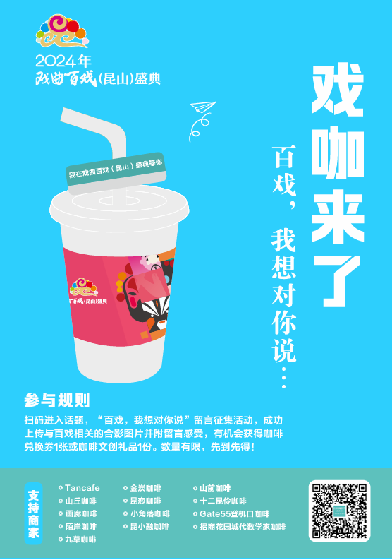 百戏盛典期间,十余家咖啡网红品牌线下近百家门店联合发布“百戏,我想对你说”留言征集活动,市民朋友成功上传与百戏盛典相关的合影图片并附留言感受,即有机会获得咖啡兑换券等奖品。
