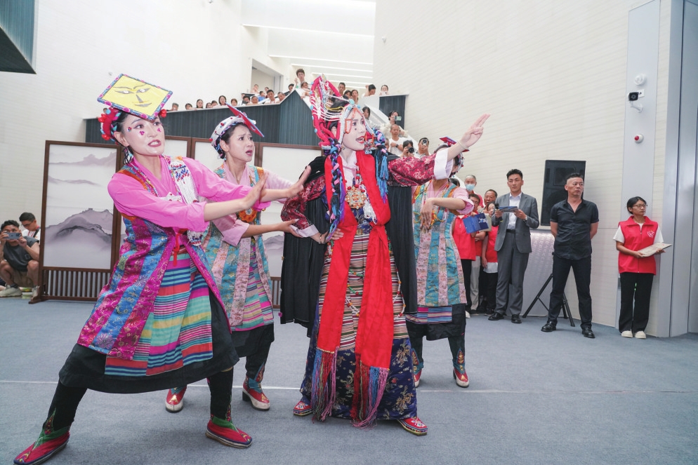 浑厚的藏戏鼓钹声响,身着藏戏服饰的演员踩着鼓点翩翩走上舞台,观众纷纷举起手机拍照,以留住这难得一见的藏戏风采。《卓娃桑姆》是八大传统藏戏之一,本次由西藏自治区藏剧团演员平珍带来的《寻王》是整部剧中最具看点的片段之一,讲述了哈香和斯玛让果主仆二人寻找公主和王子时的情景,整个寻找过程充分展示了哈香和斯玛让果两个反面人物的奸诈、狠毒,夸张的艺术表现形式、喜剧元素的巧妙表达,充分展现了演员的表演能力,将藏戏的表演技术表现得淋漓尽致。主演平珍介绍,藏戏已有600多年历史,一鼓一钹贯穿全剧,唱腔极具冲击力,有高度程式化的动作、音乐化的念白,也有仪式化的舞蹈、面具化的角色定位,独具魅力。