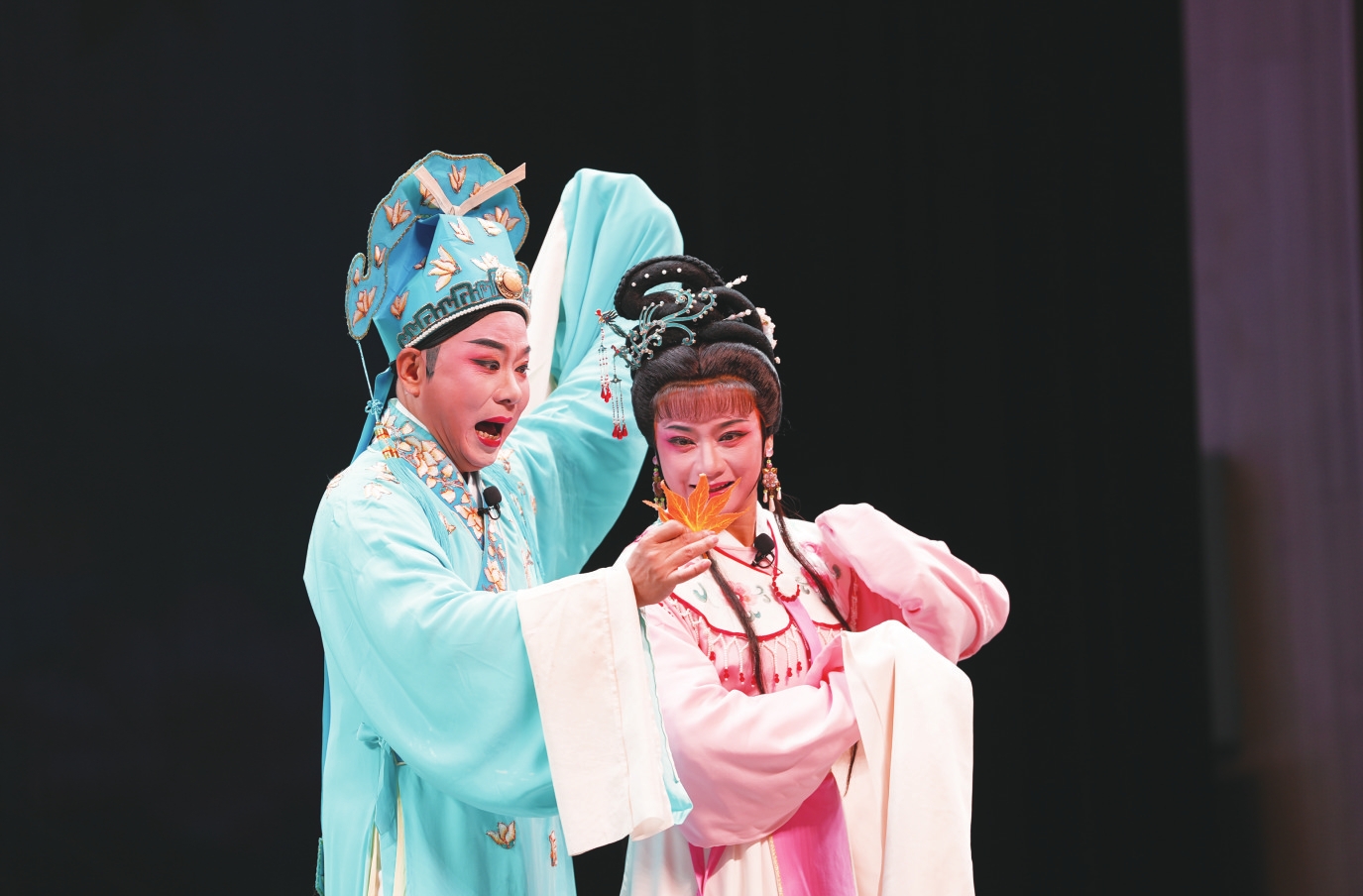 当晚7点半,琼剧《红叶题诗·园会》拉开了此次专场的序幕。该剧讲述了南宋新科状元文东和游西湖时,拾得红叶一片,上有表露少女抱负的题诗一首,文东和读后深表爱慕。后得知乃朝臣姜华之女姜玉蕊所题。晚上,二人相约花园,以诗为媒,互表爱慕之情,共结同心。主演林川媚表演过程中以气带声、以声表情、以情演戏、戏从心来,缓缓表达人物情感,高可响遏行云,低则润物无声。