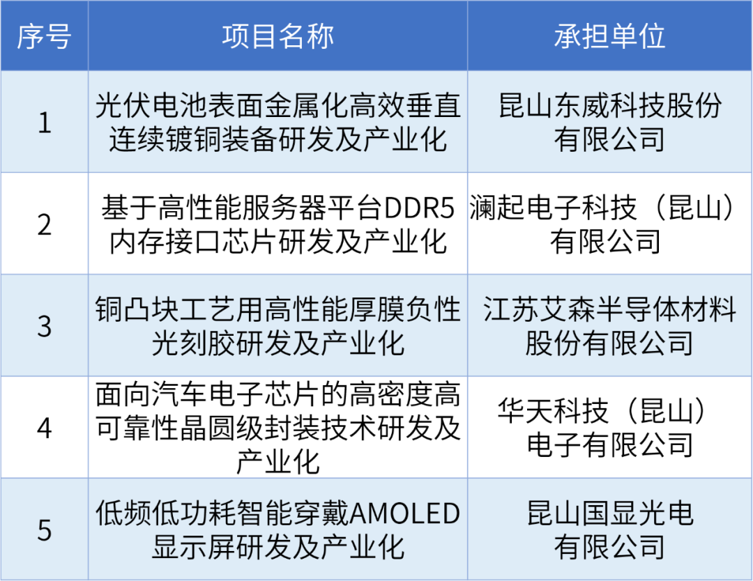 昆山此次入选的5个项目为由昆山东威科技股份有限公司承担的光伏电池表面金属化高效垂直连续镀铜装备研发及产业化项目;由澜起电子科技(昆山)有限公司承担的基于高性能服务器平台DDR5内存接口芯片研发及产业化项目;由江苏艾森半导体材料股份有限公司承担的铜凸块工艺用高性能厚膜负性光刻胶研发及产业化项目;由华天科技(昆山)电子有限公司承担的面向汽车电子芯片的高密度高可靠性晶圆级封装技术研发及产业化项目;由昆山国显光电有限公司承担的低频低功耗智能穿戴AMOLED显示屏研发及产业化。