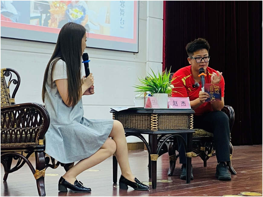 活动中,赵杰讲述了自己的成长经历及平时训练的趣事,分享了奥运赛场背后的故事以及自己回到家乡的感受。当谈到在奥运赛场上身披国旗的心情时,赵杰很是激动:“无数的日夜训练、无数的痛苦和挣扎,在为国家争得荣誉时,都变成了喜悦的泪水,我也更加感受到了竞技体育的魅力。只要坚持下去,未来一定会感谢现在的自己!”