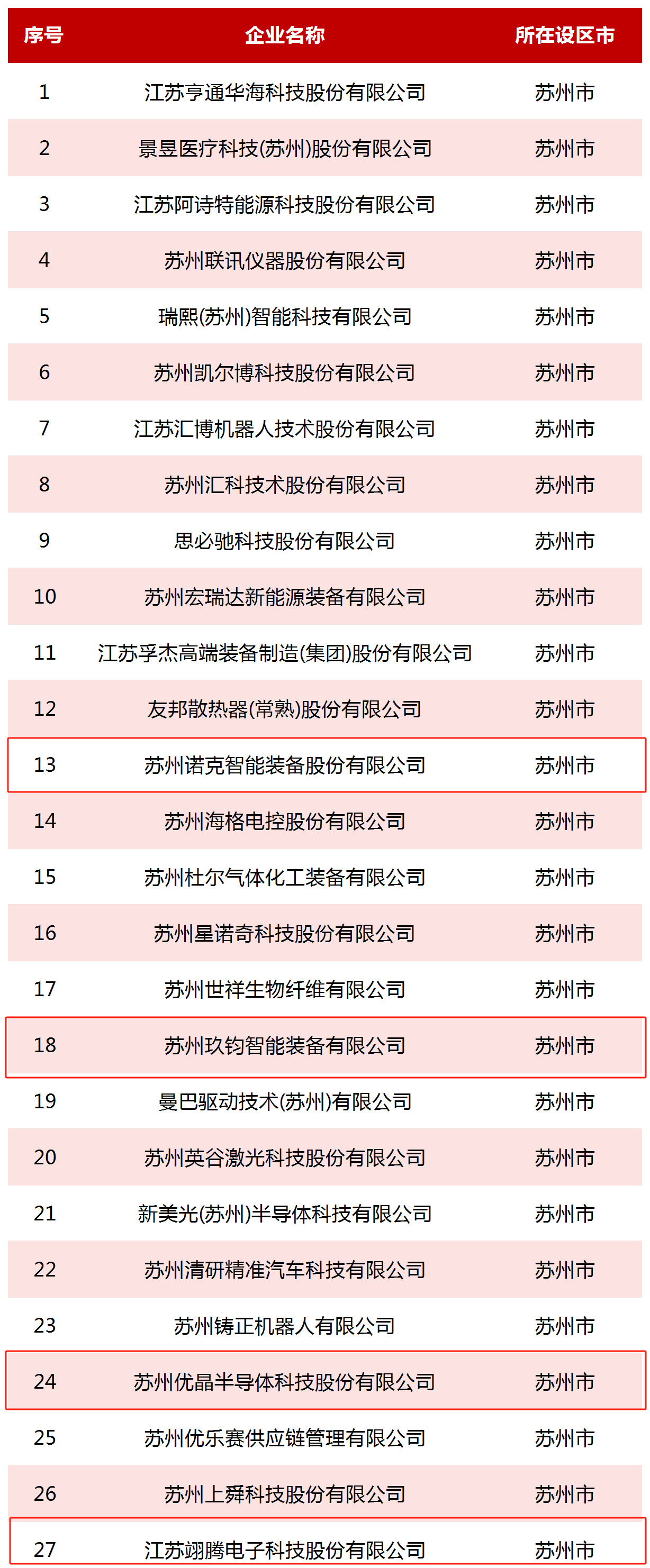 省科技厅日前对2024年度省科技企业上市培育计划拟入库企业进行公示,我市苏州诺克智能装备股份有限公司、苏州玖钧智能装备有限公司、苏州优晶半导体科技股份有限公司、江苏翊腾电子科技股份有限公司4家企业入围。