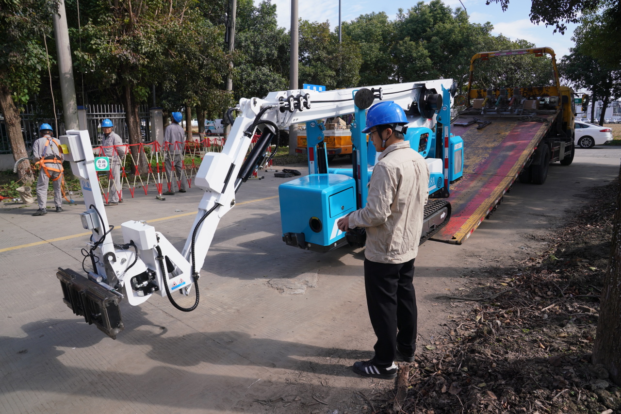 今年6月起,国网昆山市供电公司开始自主研发举升平台,安装在履带式蜘蛛举升车上。该车由长5.5米宽、0.8米的底盘和长约18米的折叠机械臂以及可调节举升平台组成,采用远程遥控的操作方式。原本需要2~3人拉拽或者吊车完成的工作,现在仅需1人遥控即可完成。