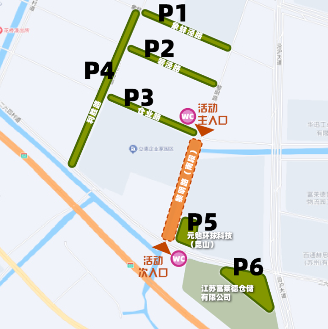 1、机动车停车:象蚌泾路(P1)、箬泾路(P2)、仓业路(P3)、利胜路(P4)路边停车位、元勉环球科技(昆山)有限公司停车场(P5)、江苏富莱德仓储有限公司停车场(P6)