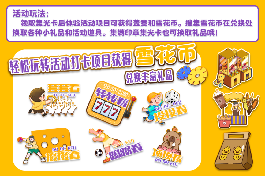 现场设有丰富的有奖小游戏。领取集光卡后参加游戏可获得项目盖章和雪花币。收集雪花币可在兑换处换取各种小礼品和活动道具。集满四个印章的集光卡也可换取礼品。