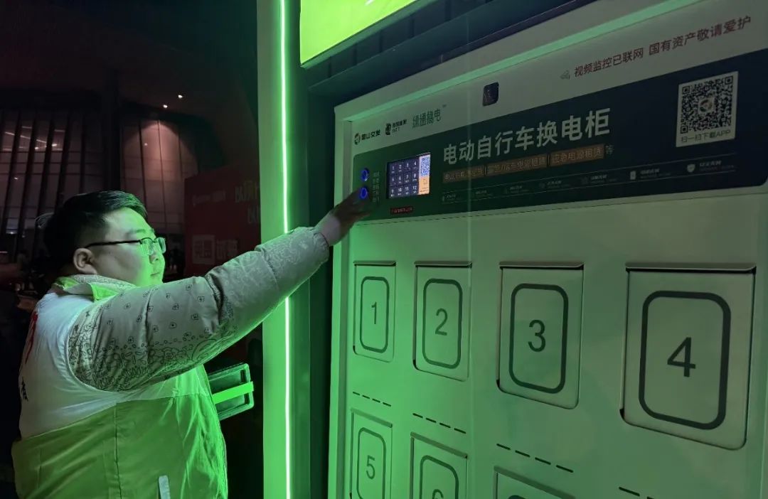 从电动自行车上取下电量耗尽的电池,按下智能换电柜换电键,把旧电池放入空舱,只要等待3秒钟,满电量新电池弹出,安装入车内,车子“满电复活”。目前,昆山已落地换电柜339个,年底前计划投放1200个换电柜,形成全市组网。