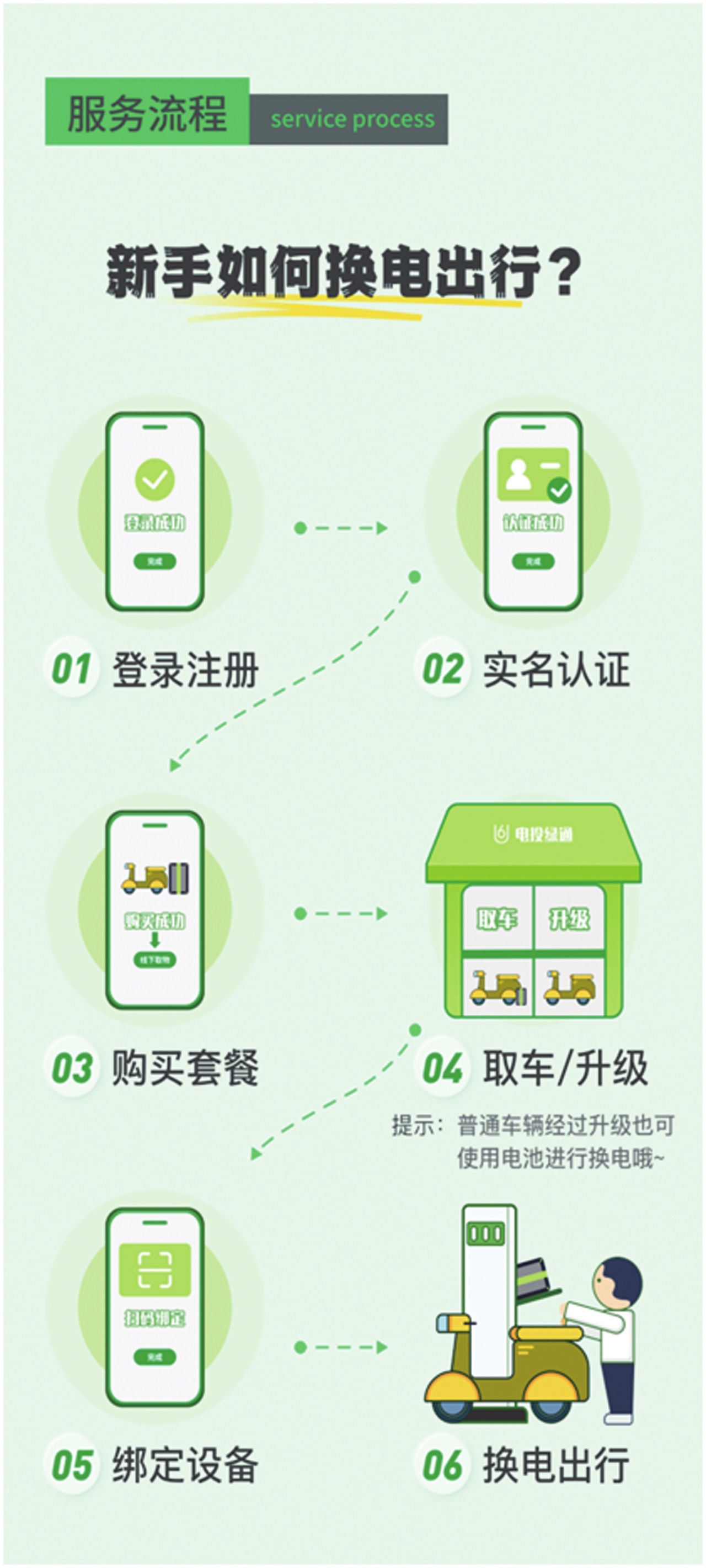 从电动自行车座舱取出低电量电池——按换电柜上按钮打开舱门——将低电量电池放入换电柜空舱,等待换电柜识别,自动关闭舱门——3秒钟后换电柜弹出满电电池,用户即可取出电池——将电池放入电动自行车座舱中,即可继续骑行。