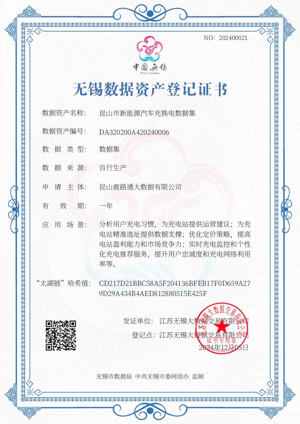 一直以来,鹿路通致力于通过数据资产化,增强企业的市场竞争力,推动数字经济高质量发展。基于“昆山市新能源汽车充换电数据集”核心数据资源,鹿路通深化加工与研发,推出“新能源汽车充换电行为分析数据服务”和“新能源汽车充换电站分析数据服务”两款数据产品,均在无锡大数据交易平台完成登记,并获得“数据产品挂牌证书”。