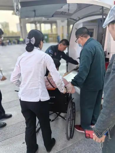 在等待救援期间,工作人员一直守护在乘客身边,直至120到来。为争取宝贵救援时间,车站还提前准备好轮椅以确保与120急救人员无缝衔接。