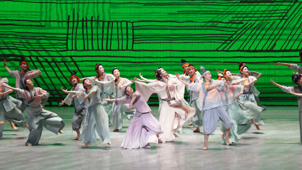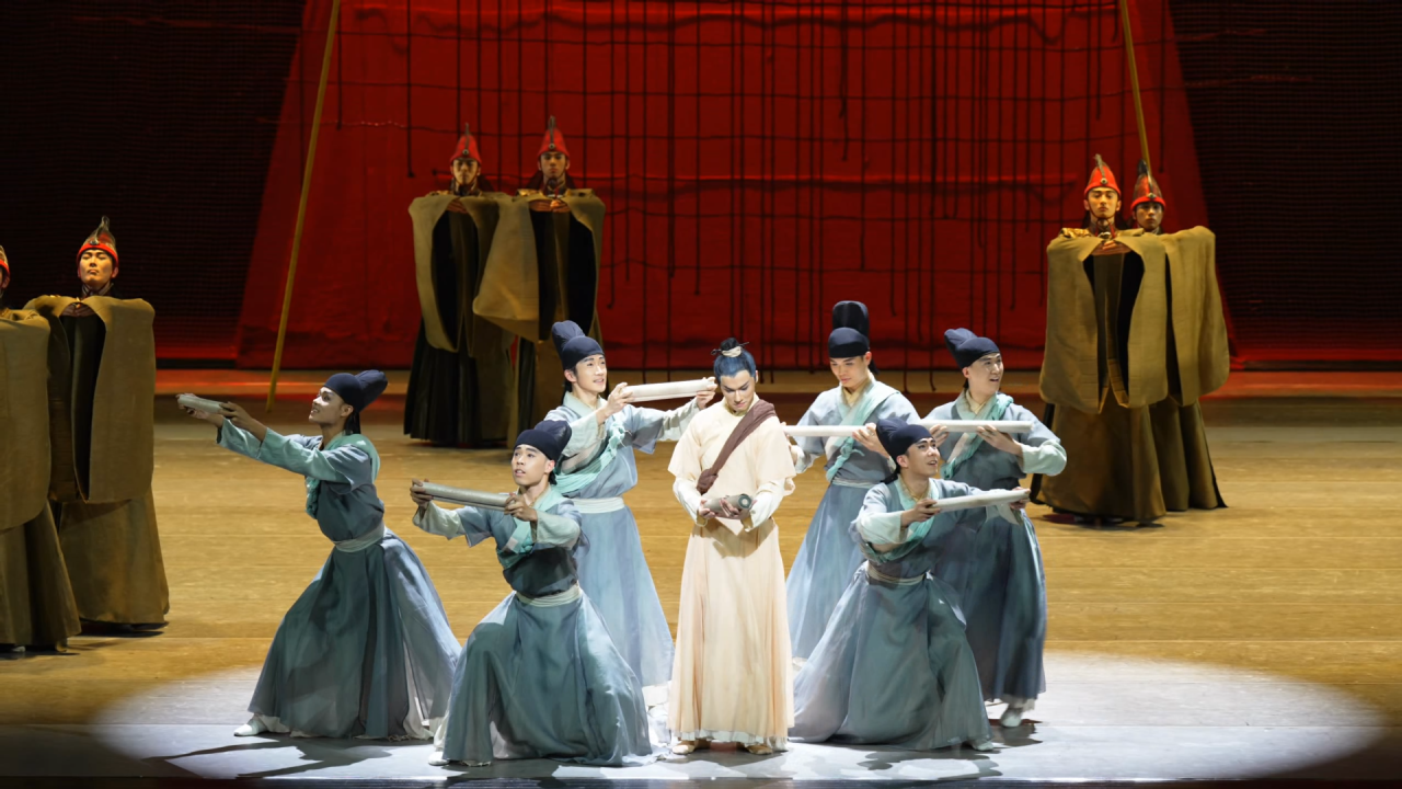 “三月三日天气新,长安水边多丽人。”舞剧《杜甫》以传唱千古的《丽人行》为开场,采用大写意手法,呈现了“壮游羁旅,踌躇满志济天下”“长安十载,求官谋事为苍生”“弃官归隐,笔底波澜惊风雨”“登高望远,历尽沧桑唱大风” 四个篇章。110分钟的表演,浓缩了杜甫从求官到做官,再到弃官,由入世到处世,再到出世的过程,意象化地呈现了“诗圣”杜甫颠沛流离、艰辛曲折的一生,以及他为诗歌理想苦苦追寻,为百姓社稷大声疾呼的崇高情操。