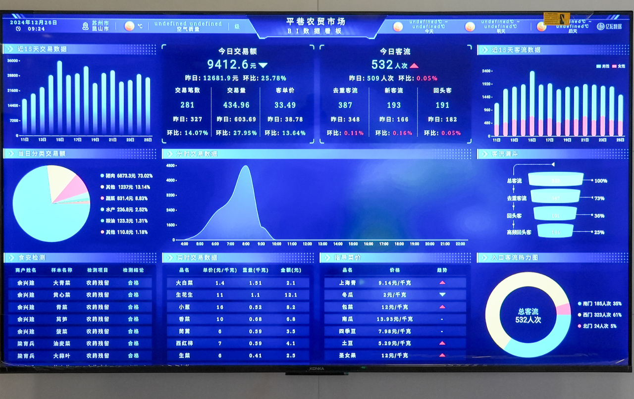 本轮改造提升行动根据苏州市《农贸市场智慧化建设与管理规范》开展智慧化建设,统一配置双面屏智能溯源电子秤等信息化设施设备,通过建成的智慧农贸市场监督管理系统,可基本实现交易数据的实时收集、实时监管,整体实现信息公示、明码标价、商品溯源、数据共享等数字化一体功能。