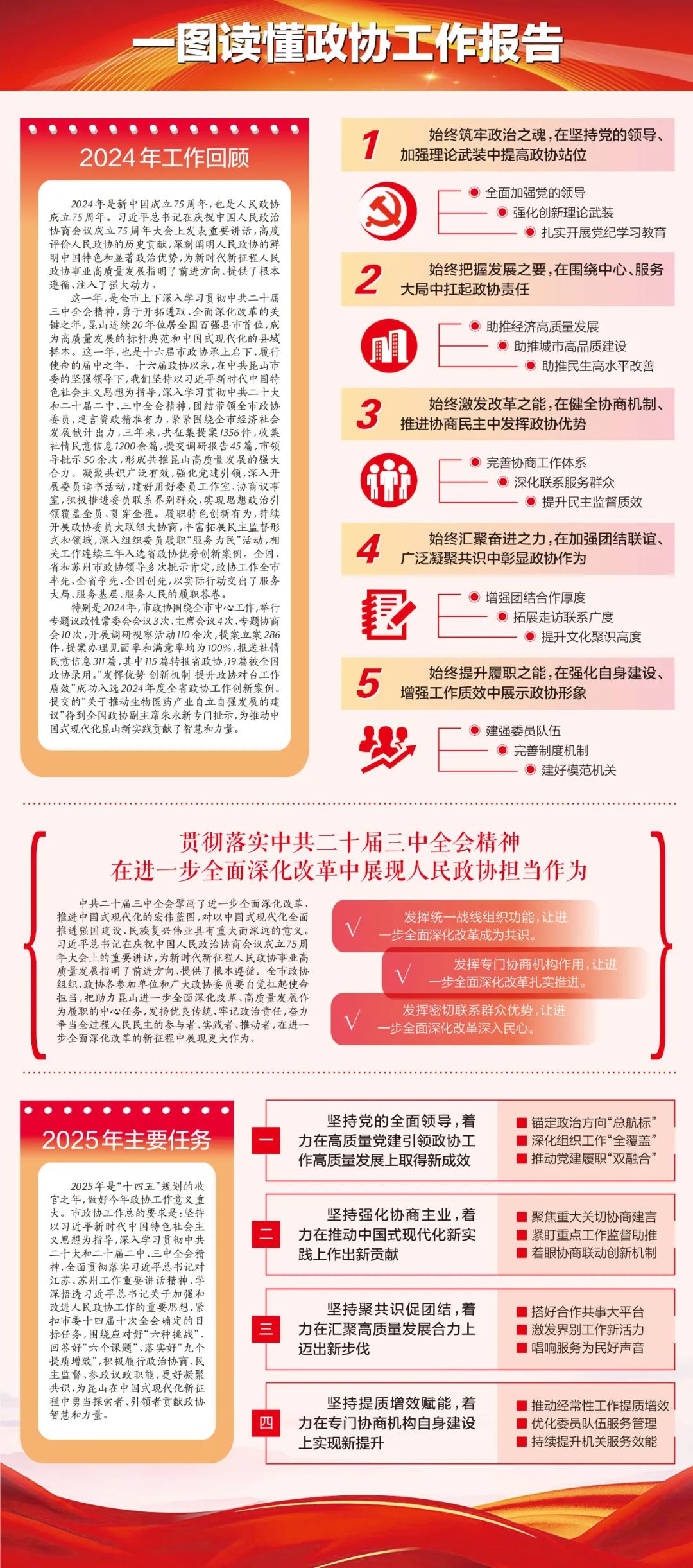 2025年是“十四五”规划的收官之年。市政协工作总的要求是:坚持以习近平新时代中国特色社会主义思想为指导,深入学习贯彻中共二十大和二十届二中、三中全会精神,全面贯彻落实习近平总书记对江苏、苏州工作重要讲话精神,学深悟透习近平总书记关于加强和改进人民政协工作的重要思想,紧扣市委十四届十次全会确定的目标任务,围绕应对好“六种挑战”、回答好“六个课题”、落实好“九个提质增效”,积极履行政治协商、民主监督、参政议政职能,更好凝聚共识,为昆山在中国式现代化新征程中勇当探索者、引领者贡献政协智慧和力量。