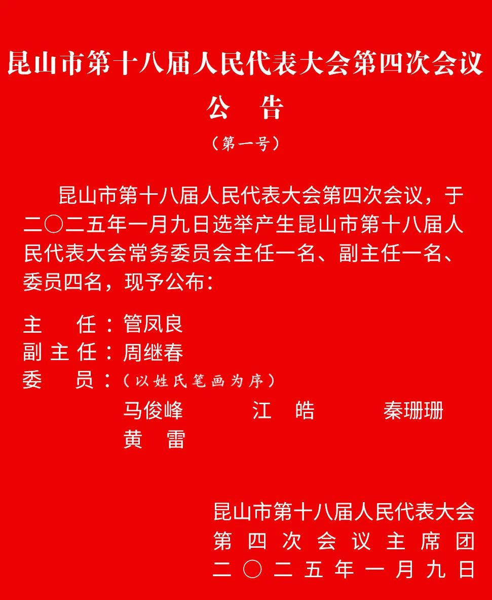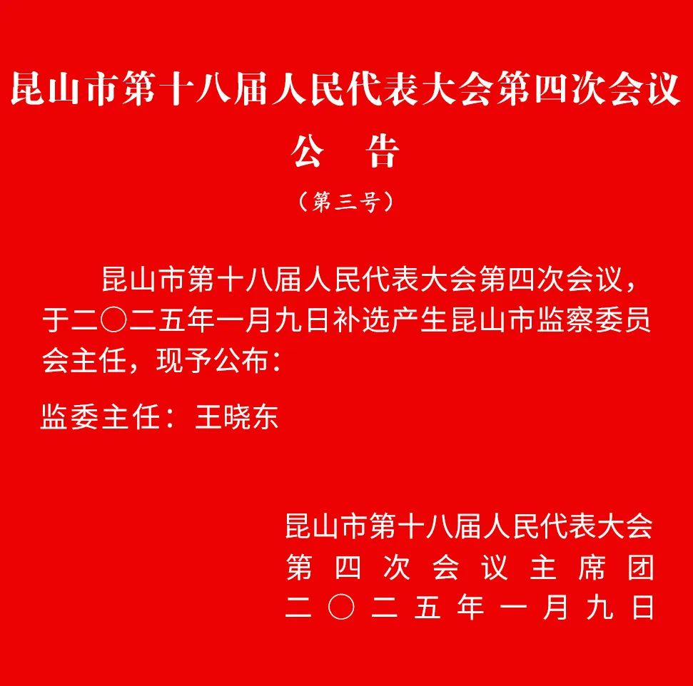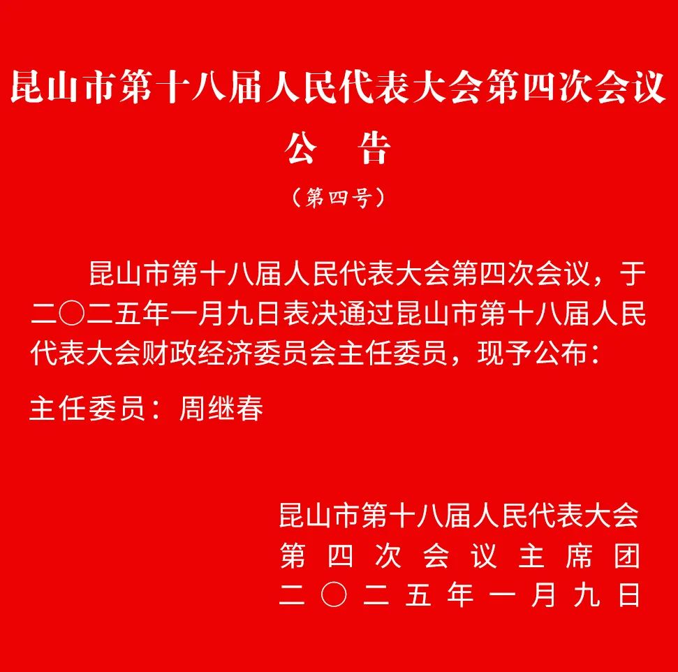 1月9日上午,昆山市第十八届人民代表大会第四次会议举行第三次全体会议,选举产生了昆山市第十八届人民代表大会常务委员会主任、副主任、委员,昆山市人民政府市长,昆山市监察委员会主任;表决通过了昆山市第十八届人民代表大会财政经济委员会主任委员。