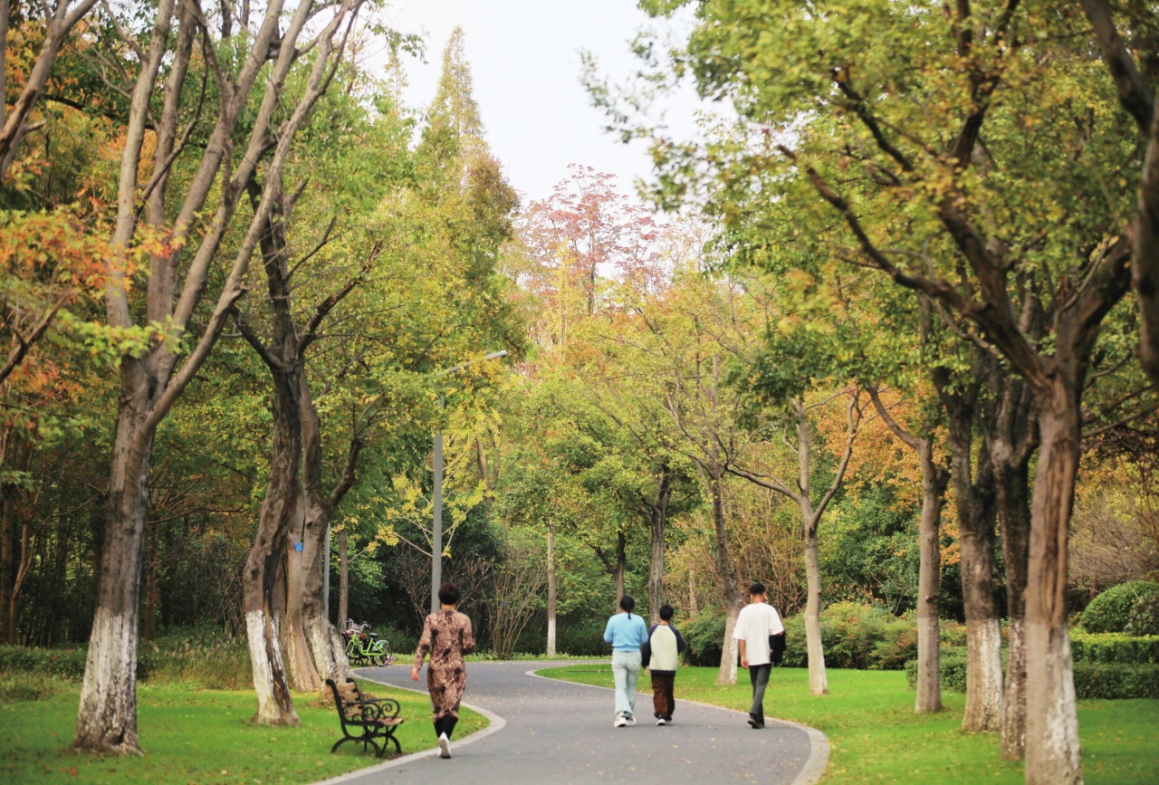 初冬的庙泾河生态廊道风景宜人,两岸层林尽染,庙泾河水碧绿,构成一幅美丽的油彩画卷。