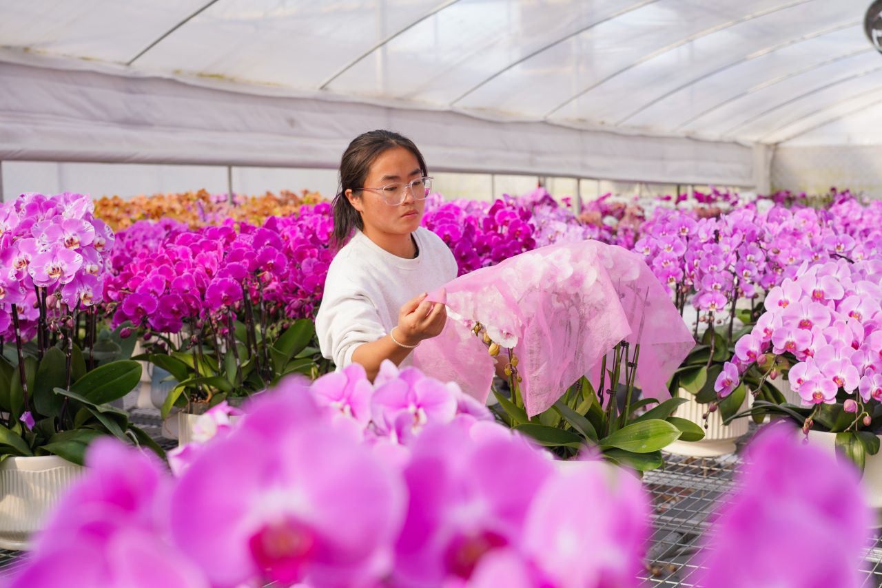 记者在基地看到,一盆盆颜色、形态各异的蝴蝶兰包装很精美,还被盖上了一层喜庆的“红盖头”,一车车发往周边各地。也有不少市民来到基地直接挑选,工作人员十分贴心地为他们提供个性化的设计和组盆,充分满足大家多样化的购花需求。