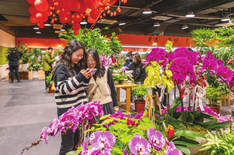 傍晚时分,在昆山万象汇室外的嗨街上,新春壮锦蛇纹烟花艺术装置吸引了众多市民驻足观赏。这些装置将东方美学与现代元素完美融合,展现出独特的艺术魅力。在年宵花展陈区,蝴蝶兰、郁金香等花卉竞相绽放,市民们沉浸在花艺景观中,享受着闲暇时光。