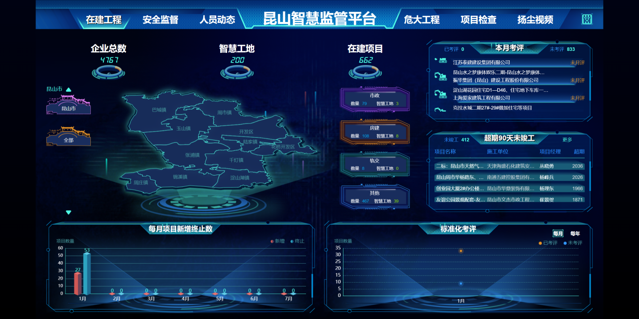 智慧工地赋能精细管理。昆山市自2021年被列为智慧工地示范片区以来,累计建成415个智慧工地。通过数据集成分析,涵盖人员管理、扬尘监测、隐患排查等功能模块,实现智能化、实时化监管,提升施工现场的管理效能。