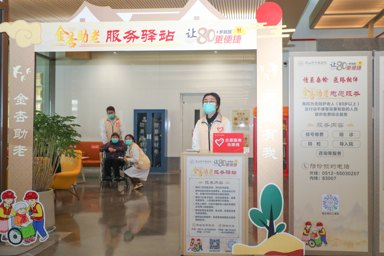 出发前,陈大娘让孩子在“昆山市中医医院”微信小程序提前预约助老陪诊服务。专线到达院区后,志愿者早早在站点等候,核对信息后用轮椅将陈大娘推送至“助老服务驿站”休憩。这里不仅摆放着柔软的休息专椅,轮椅、老花镜、放大镜等各类适老化便民设施设备也一应俱全,以便满足老年患者的不同需求。