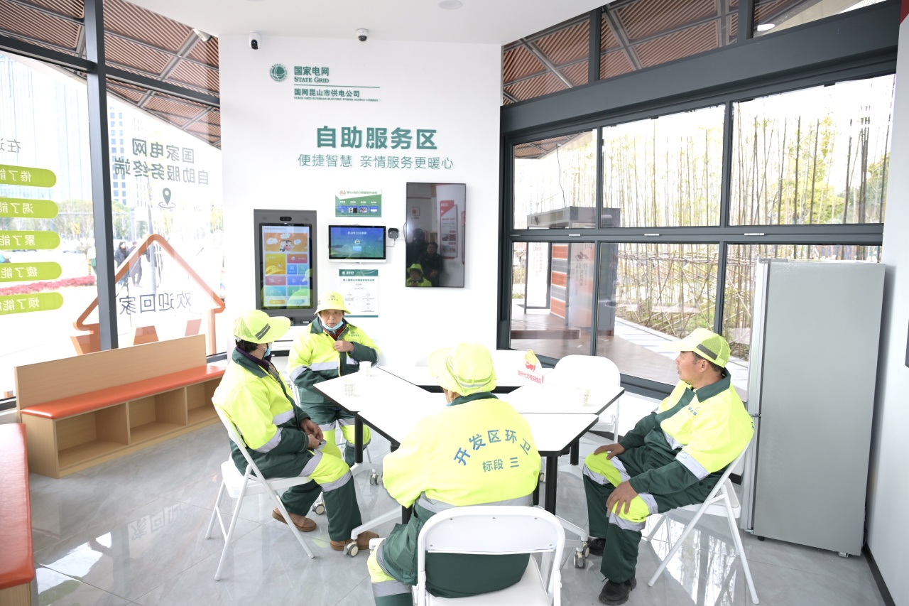 “爱心e站是专门为户外劳动者打造的暖心港湾,不仅提供冷热饮水、应急药箱等基础服务,还特别设置了国家电网5G客服自助服务终端,市民朋友可以通过5G客服进行用电咨询、电费缴纳等视频一对一自助服务。”国网江苏电力(昆山服务到家)共产党员服务队队员吕怡航介绍。