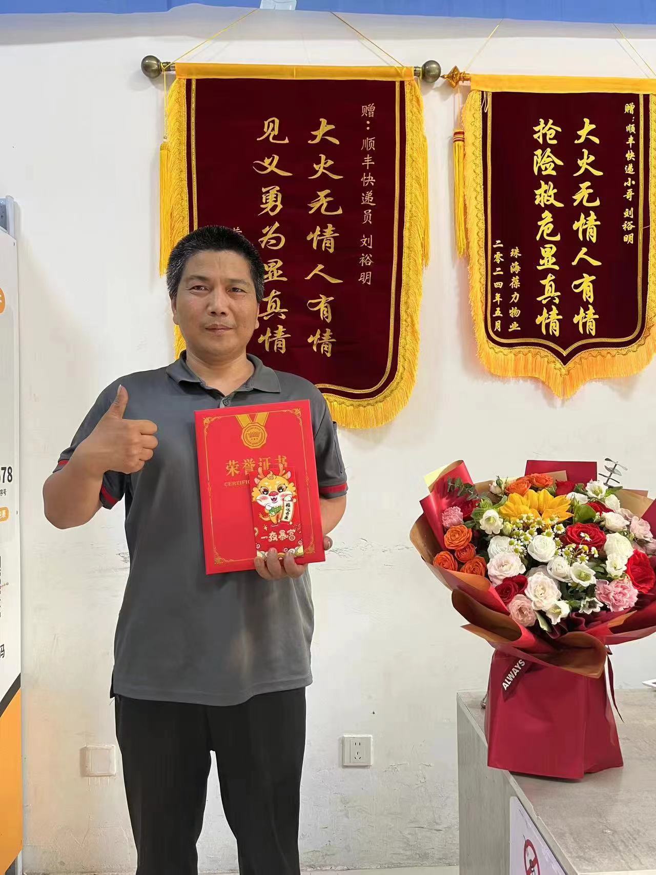 2024年5月的一个傍晚,千灯镇黄浦君庭小区内,一道浓烟突然从某栋楼翻涌而出。此时,45岁的顺丰快递员刘裕明正在小区中派送包裹。“出事了!”抬头望见黑烟的刘裕明立刻将快递车甩在一边,如离弦之箭冲向火场——这个瞬间,定格了平凡生活中的英雄时刻。