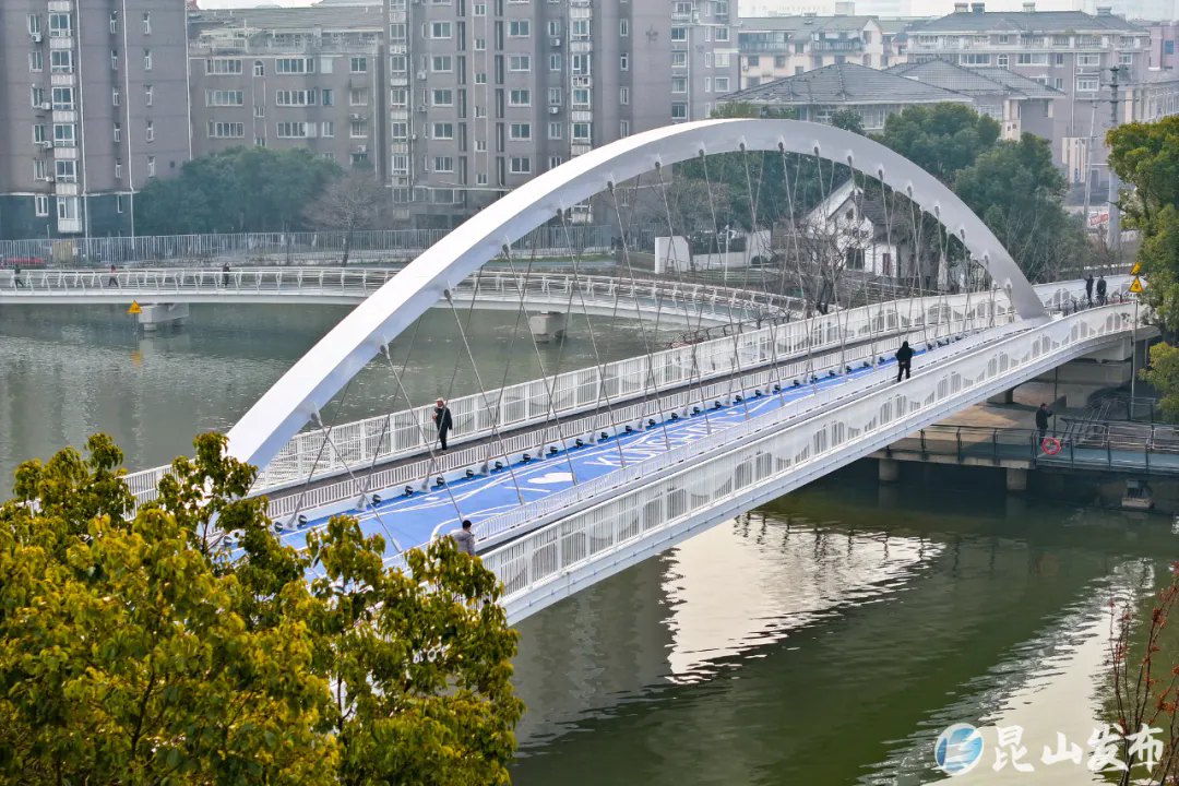 作为市重点实事工程——环城滨江绿道(二期)的重要内容,东樾河桥北接滨江公园、南接爱河小区,主桥单跨65米,采用钢系杆拱桥,宽度由北侧14米过渡到南侧8米。桥梁外表面颜色主要为白色,与蓝天和白云相呼应,如同一条简洁的线,将滨江公园的风景恰到好处地连接起来,和谐且自然地融入桥位环境。桥面的设计图案也很巧妙,带有“我爱昆山”字样的蓝色彩绘,不仅突出了城市地标,还成为一道亮丽风景。
