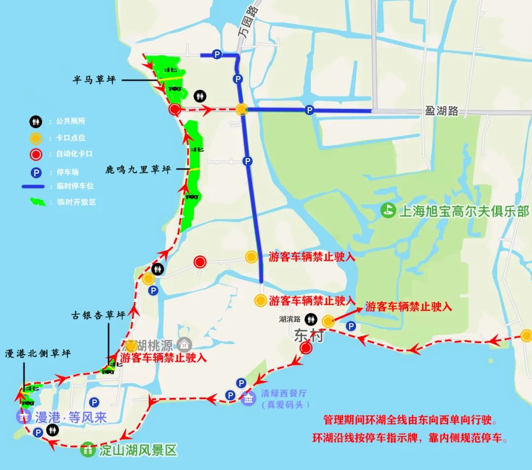 2025年3月起,逢节假日期间,环湖大道采取由东向西单向行驶,车辆统一从双永路(梦莱茵)驶入,盈湖路(半马草坪)驶出。