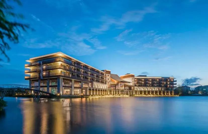一路骑行,抵达水月周庄铂尔曼酒店。暮色中,酒店灯光点亮湖岸,骑行身影与晚霞一同融入水乡的温柔夜色。