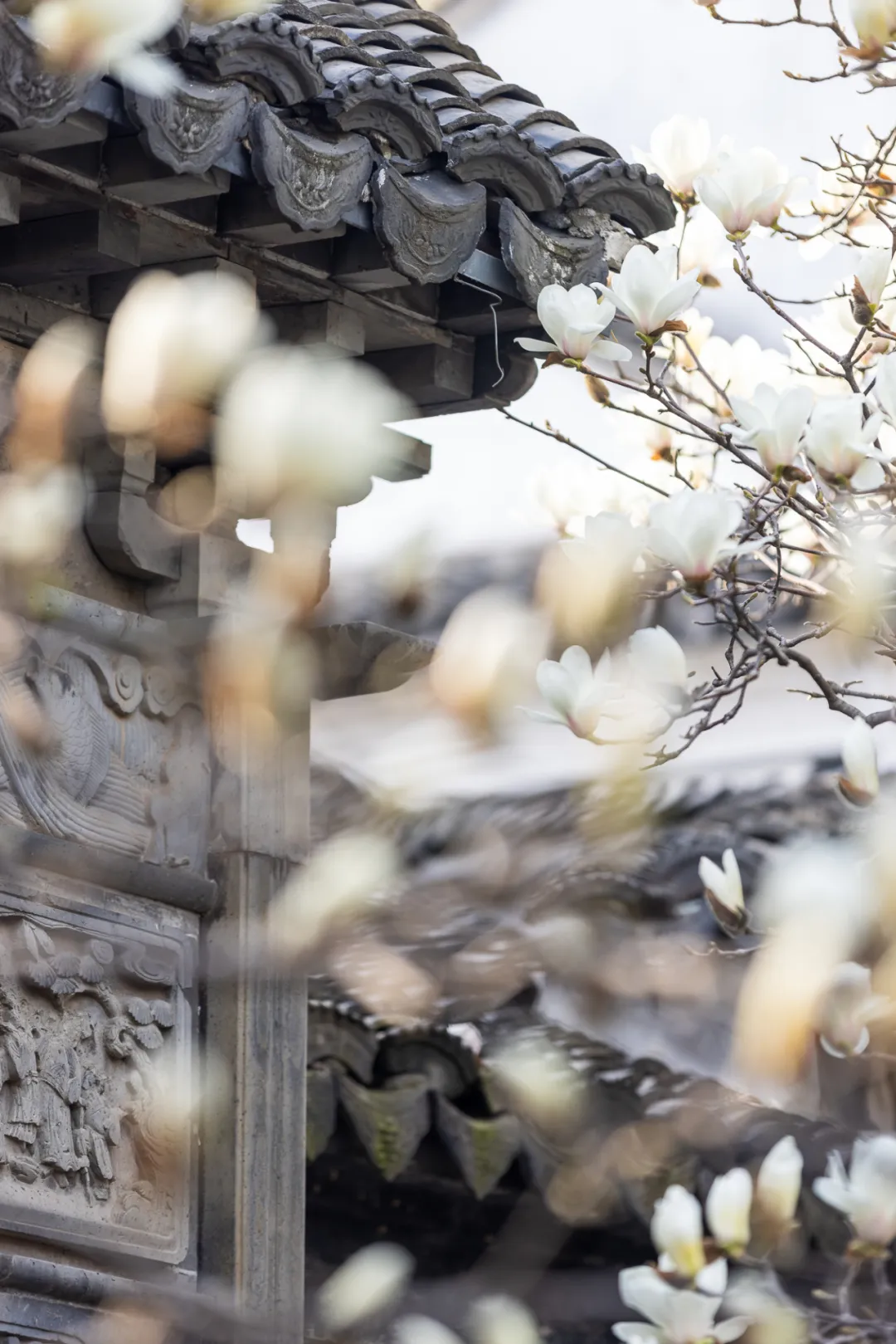 白墙黛瓦间探出的一枝玉兰