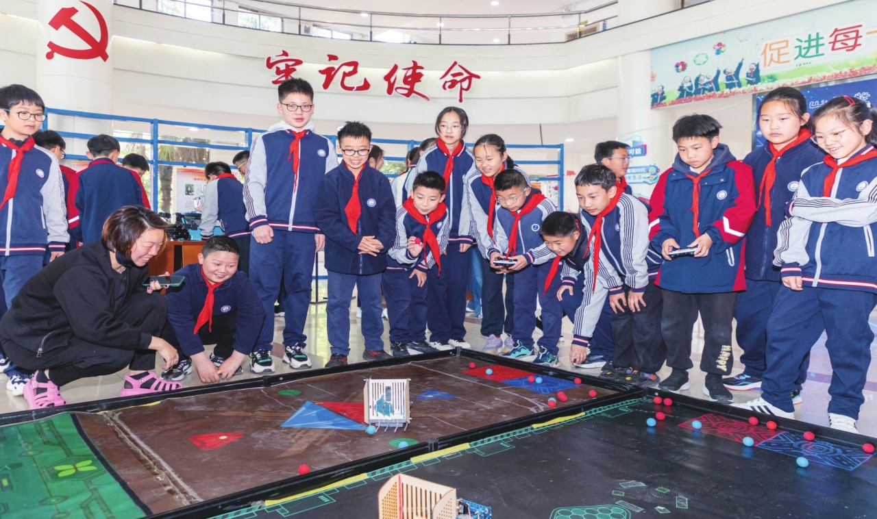 学生们还走进3D打印、激光切割、元宇宙、多元交互编程墙、MakeX《零碳行动》场地等五大前沿科技展区,与各种机器人、机器狗、机械手等亲密互动。整个“梦想空间”化身为科技探索乐园:在3D打印工作坊,学生们把天马行空的想象变成触手可及的模型;在激光切割区,精密仪器赋予设计以生命;在机器人竞赛区,正上演着速度与智慧的较量;VR设备让学生们穿梭虚拟与现实;流光溢彩的多元交互编程墙,引导学生们用代码点亮星辰大海……“我以后一定要好好学习,用AI改变生活,让祖国更加繁荣富强。”六(4)班学生陈睿体验后感到受益匪浅,也对科技改变生活有了新的认知。