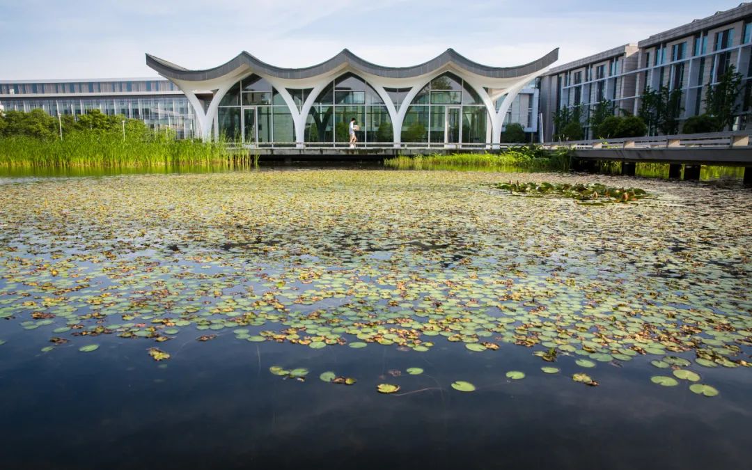 ▲校园中心湖采用生态设计,与自然水体连接,种植十余种水生植物