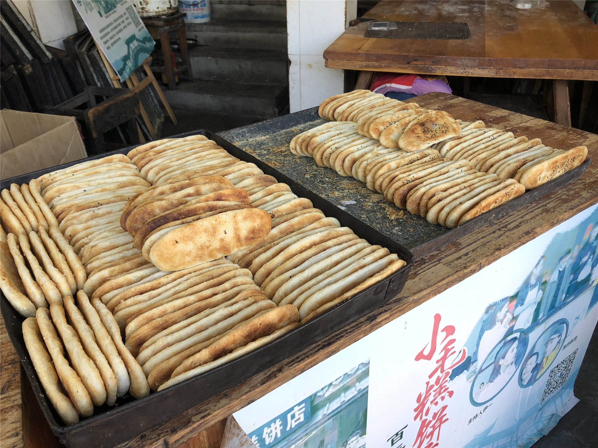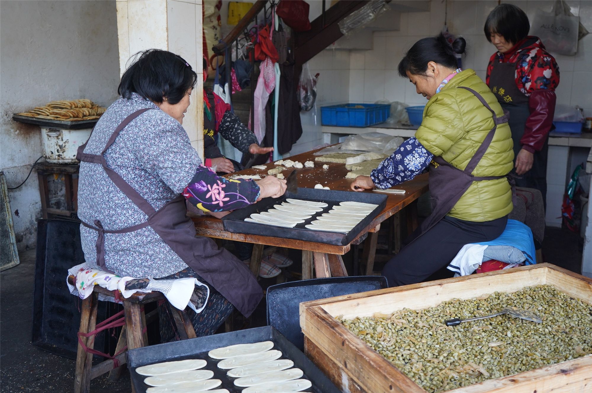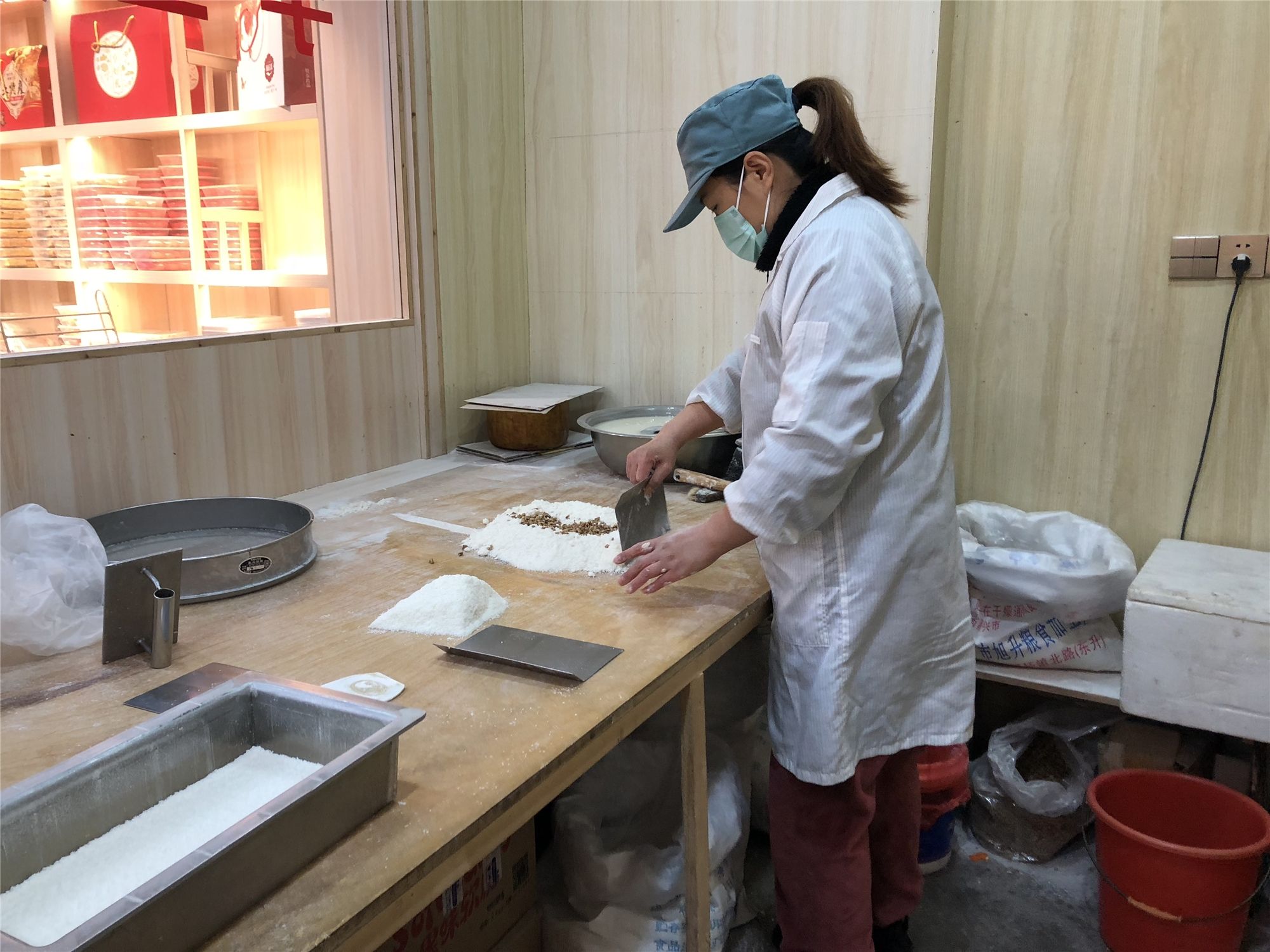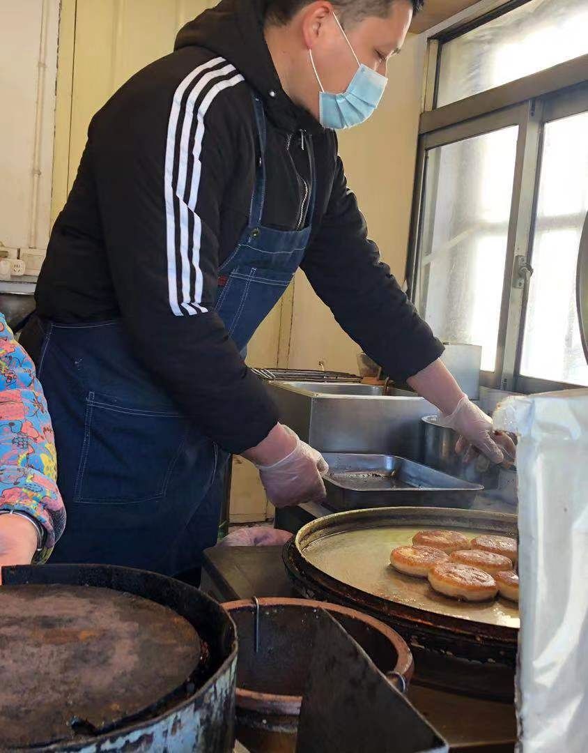 随后,记者观摩了袜底酥的制作过程。首先制面皮,在面粉中加入糖、油、温水拌匀,然后平摊冷却;其次制油酥,将面粉与猪油混合,揉捏至与面皮软硬度相似;然后做馅,先将绵白糖、猪油、精盐拌匀,再将香葱切细捣碎加入搅拌,这样才能不穿孔,不露馅;最后制坯,面皮内包入油酥,卷成圆形条状,最后制成袜底状。“三分料,七分烤。烘烤决定袜底酥的好坏,这是技术性很高的活儿。烘烤时,师傅要一步不离地守在边上,当酥饼呈现出鲜亮的光泽、散发出清香时,袜底酥就可以出炉了。”沈浩告诉记者。