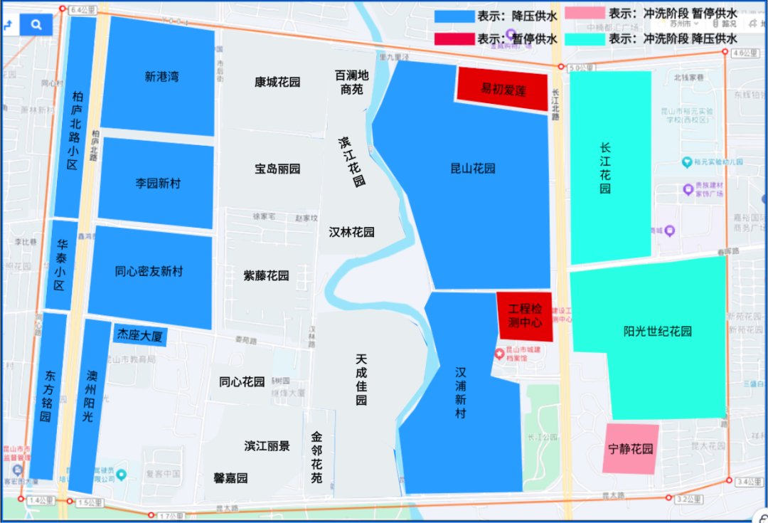 维修施工期间,澳洲阳光、东方铭园、杰座商住楼、密友新村、华泰花园、李园新村、柏庐北路小区、新港湾、昆山花园、汉浦新村10个小区进行降压供水(高峰时段部分直供的顶上二层用户可能会出现停水);昆山市工程质量检测中心、易初爱莲停止供水。