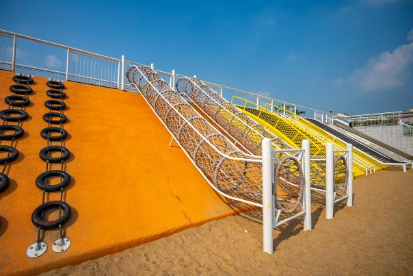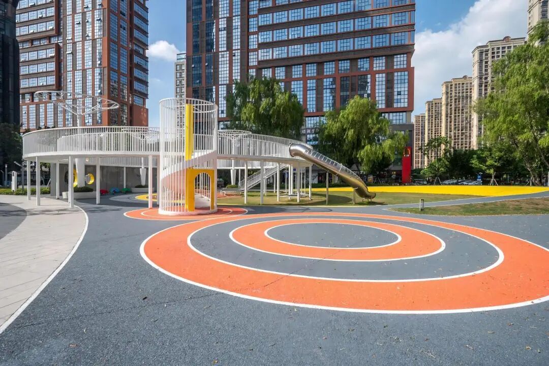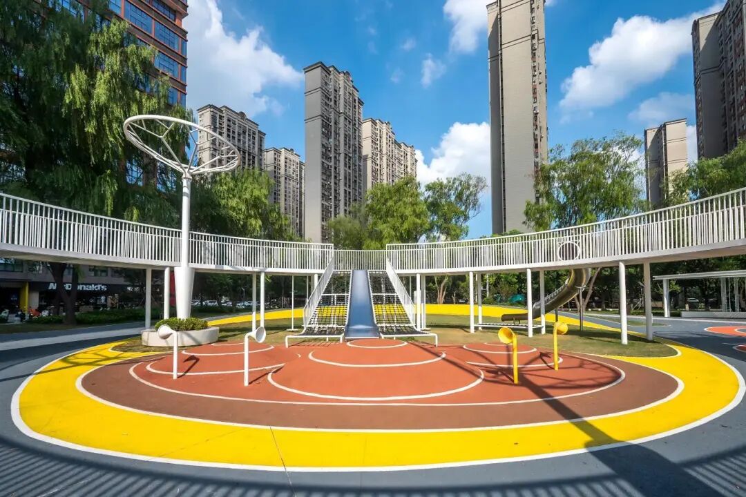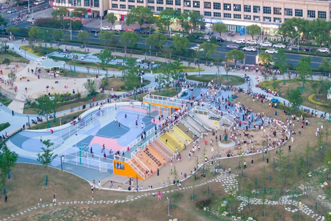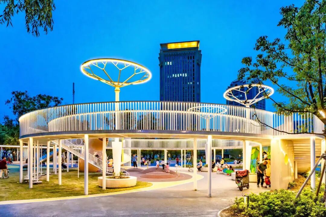 如今,这片曾经的闲置空地焕发新生:裸露地表蜕变为葱郁草坪,点缀错落有致的景观小品,精心构筑成集休憩、娱乐、运动于一体的活力空间。上班族在此散步聊天,释放工作压力;居民们则遛娃闲逛,尽享城市美好。尤其夜幕降临,公园更显热闹:年轻人在篮球场上挥汗如雨;父母带着孩子于游乐区嬉戏,天桥与滑梯间回荡着银铃般的笑声;老人们或沿步道缓行,或在长椅闲话家常。城市更新的意义,于此鲜活呈现。