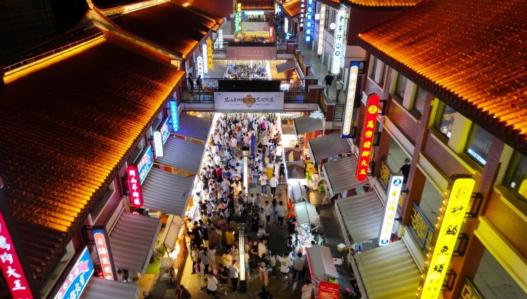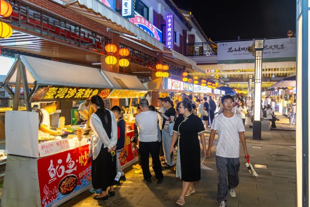 灯会的魅力,还在于它营造了一个共享的生活空间。人头攒动的“慧聚夜市”里,蚵仔煎、珍珠奶茶与臭豆腐、烤串比邻而居,满足着两岸食客的味蕾。大家在咖啡的醇香中,欣赏两岸艺匠的文创手作,于热闹中取一份闲适。这里不仅是“吃喝玩乐”的场所,更是两岸生活美学交融的微缩景观。正如一位老台商所言:“在这里,我能找到家乡的味道,也能品味昆山的韵味。这就是‘家’的感觉。”