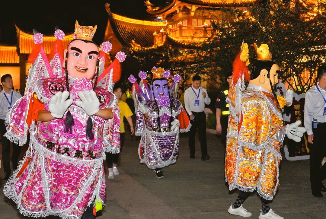以“两岸民俗文化日”为主线的民俗展演是灯会的核心板块。10月1日,国风游园会盛大开启,衣袂翩跹的汉服巡游队伍带你漫步如诗画境,与风趣雅致的NPC互动对诗。当“电音三太子”踩着动感节拍穿梭在人群中,呈现出潮流与传统相融的奇妙碰撞;当“畊练团”带领全场观众在灯火下活力跳操时,传统与现代、台湾元素与大陆潮流完成了奇妙的化学反应……一位带着孩子前来观看的市民王女士说:“孩子看到电音三太子特别兴奋,我觉得这特别好,让他能在快乐中,直观地感受到对岸同胞的文化,知道我们是一家人。”