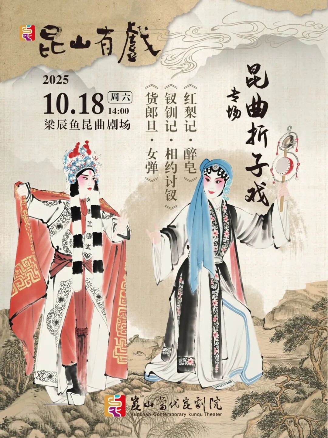 昆山当代昆剧院十周年精品演出,呈现《红梨记·醉皂》《钗钏记·相约讨钗》《货郎旦·女弹》三折,以匠心传承,致敬百年雅韵。