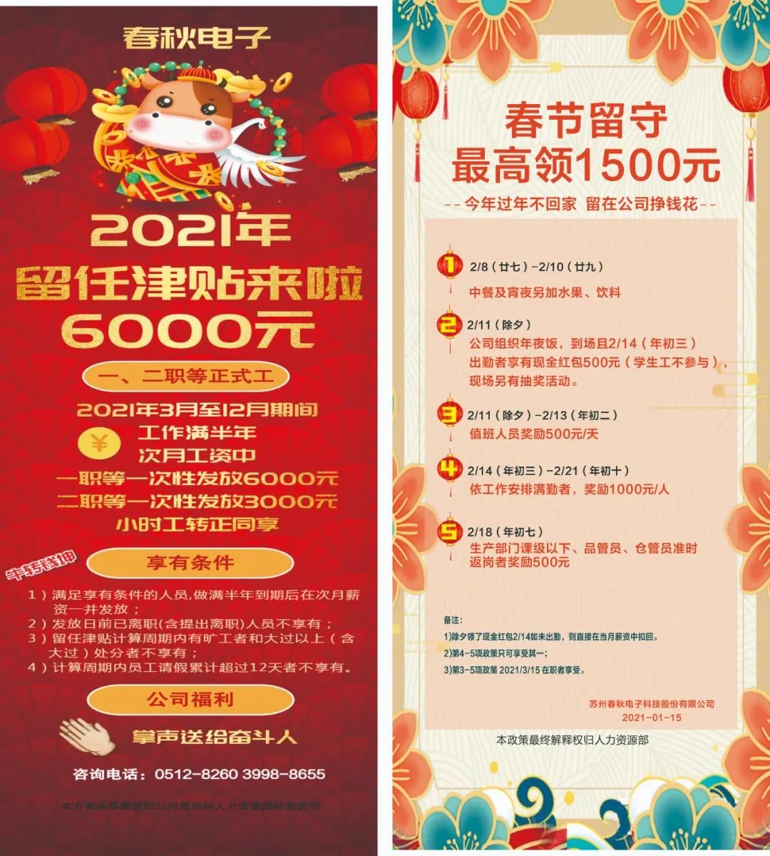 苏州春秋电子科技股份有限公司出台相关政策,给予就地过年的员工物质奖励,最高可领1500元奖金,伙食供应也会更加丰富。